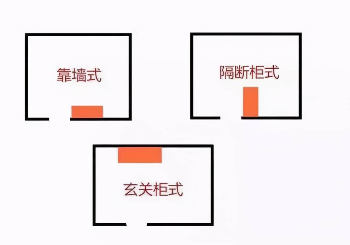玄关鞋柜的摆放情势主要包含三种,即靠墙式、隔绝柜式和玄关柜式。