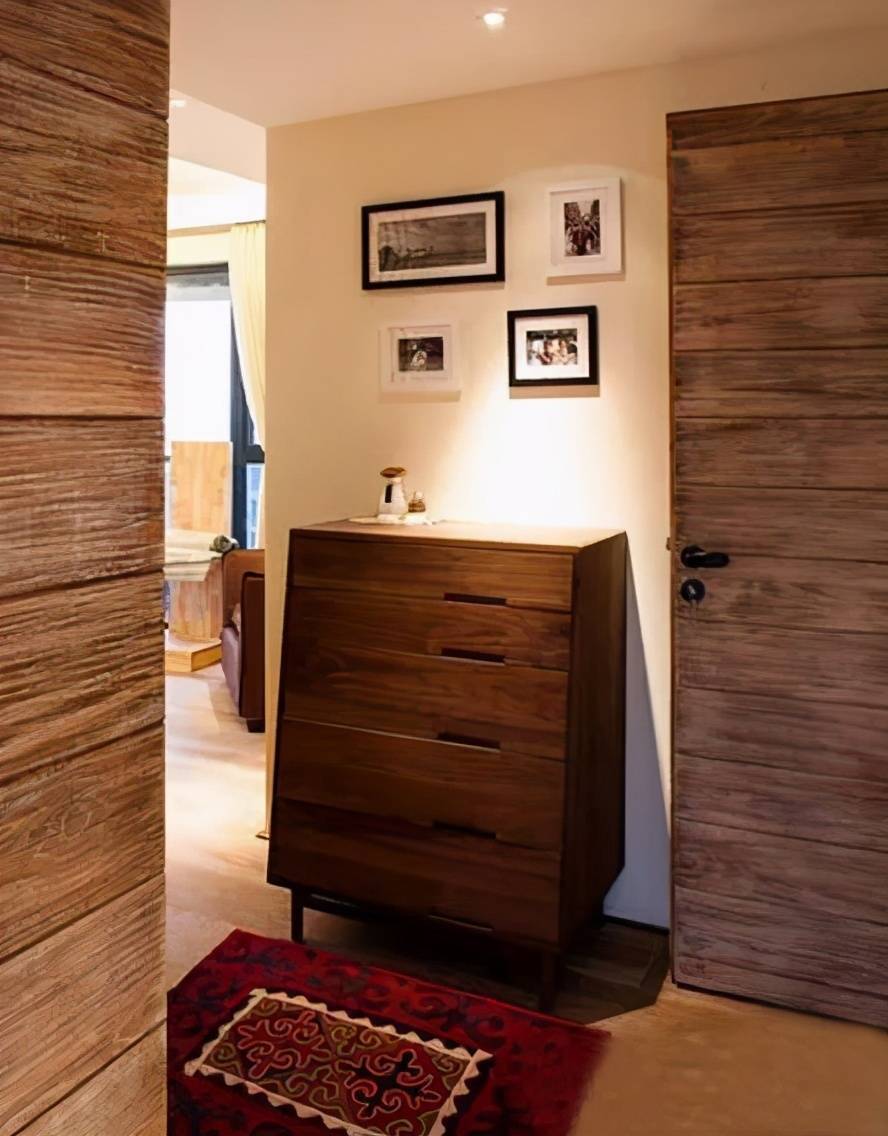 靠在门旁墙上的玄关鞋柜,能让业主在进门之际,顺遂将包包、手机等物品抛弃于柜面上,随后进行换鞋,这是颇为实用的一种联想。此外,还可在墙壁上吊挂精细的画作,营造出邃密的居住氛围。
