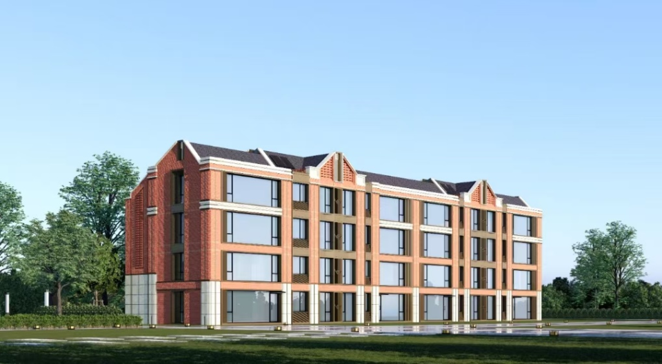 红砖风外立面,带架空层。