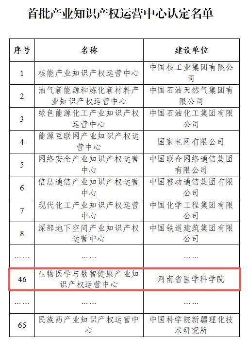 大河网讯 近日,国度学问产权局学问产权愚弄促进司公示《首批产业学问产权运营中心认命名单》,生物医学与数智健康产业学问产权运营中心名列其中,承建单元为河南省医学科学院。