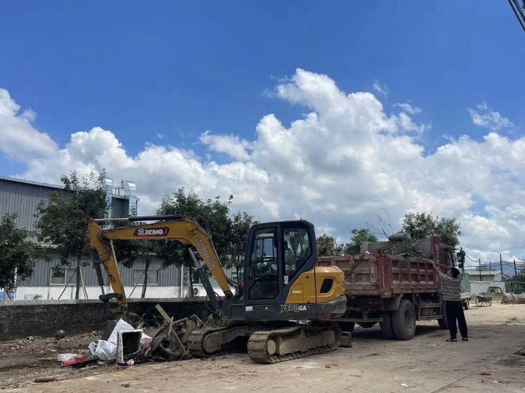 大型机械入场对墟落左近永远堆积的建筑垃圾、无东谈主居住的铁皮房等进行清算。受访者供图