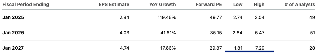 为止2027年1月的财年,英伟达的高EPS展望是低EPS展望的4倍。这一各别是由于对公司市集份额、利润率和收入增长的预期。就为止2027年1月的财年的普遍EPS展望而言,英伟达股票的交游价钱为30倍。这赫然高于台积电为止2026年12月财年的不到20的预期市盈率。